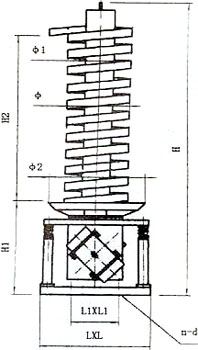 ZC系列垂直振動輸送機的驅(qū)動裝置振動電機安裝在輸送塔下部,兩臺振動電機對稱交叉安裝,輸送塔由管體和焊接在管體周圍的螺旋輸送槽組成,輸送塔座于減振裝置上,減振裝置由底座和隔振彈簧組成。(見圖一)當(dāng)垂直輸送機工作時,根據(jù)雙振動電機自同步原理,由振動電機產(chǎn)生激振力,強迫整個輸送塔體作水平圓運動和向上垂直運動的空間復(fù)合振動,螺旋槽內(nèi)的物料則受輸送槽的作用,作勻速拋擲圓運動,沿輸送槽體向上運動,從而完成物料的向上(或向下)輸送作業(yè)。